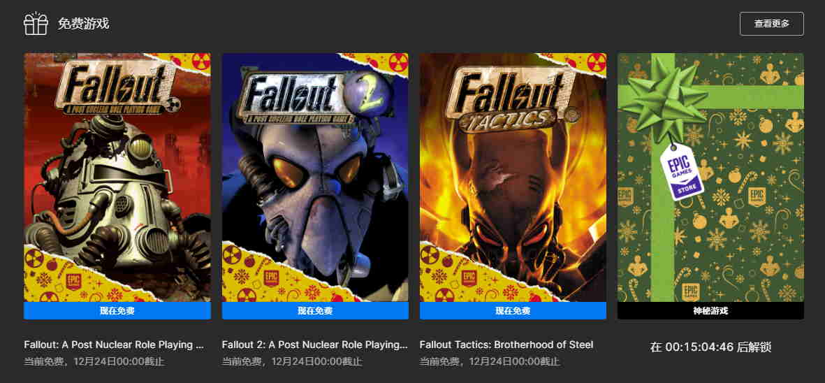 EPIC年终福利赠送15款免费游戏,每天一款,赶紧入库收藏吧!!! 今天是第八弹,送出的第八款游戏是辐射1+2+钢铁兄弟会 无中文,官方无中,喜欢这款游戏的赶紧...