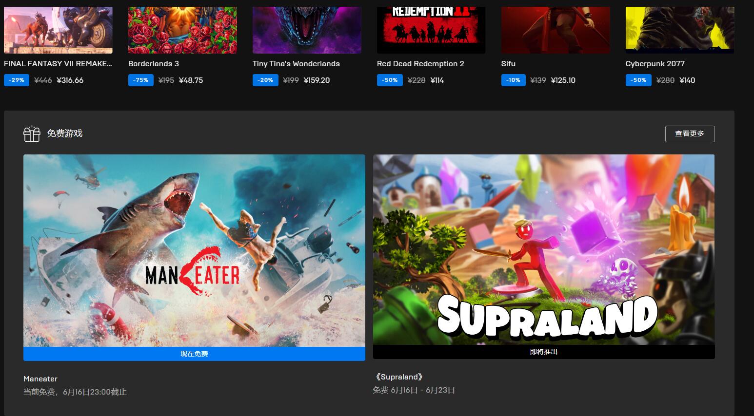 今天又到EPIC游戏的周白嫖时间,今天免费的游戏是《Maneater》/食人鲨 不含DLC 感兴趣的小伙伴们赶紧去看看吧。 活动截至2022/06/16 23:...